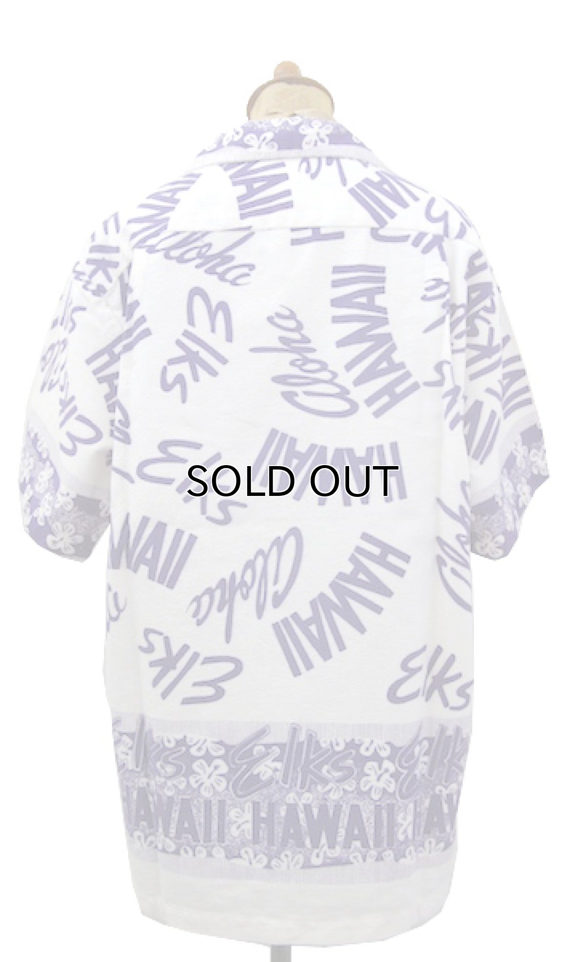 柄は、ホワイトのボディにパープルで "HAWAII""ALOHA""ELKS"の文字やハイビスカスが描かれています。