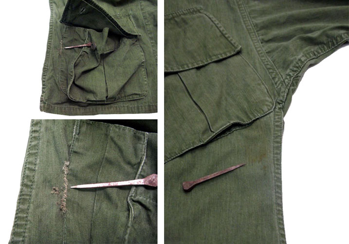 フロント右下ポケット縁に直し、小穴、左脇に汚れ、