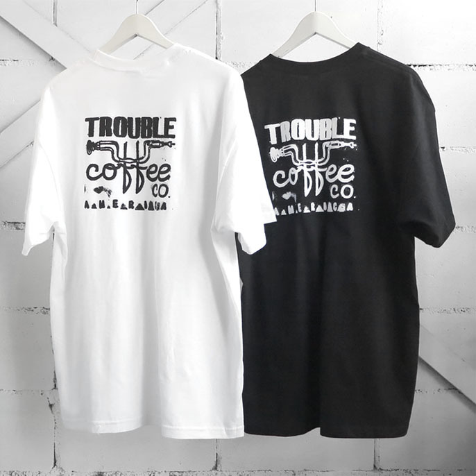 NEW "TROUBLE COFFEE" -SHOP LOGO- Back Print Pocket T-Shirt WHITE size L, XL