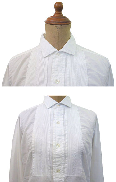 胸に柄が入ったタックシャツ、袖はダブルカフス仕様。